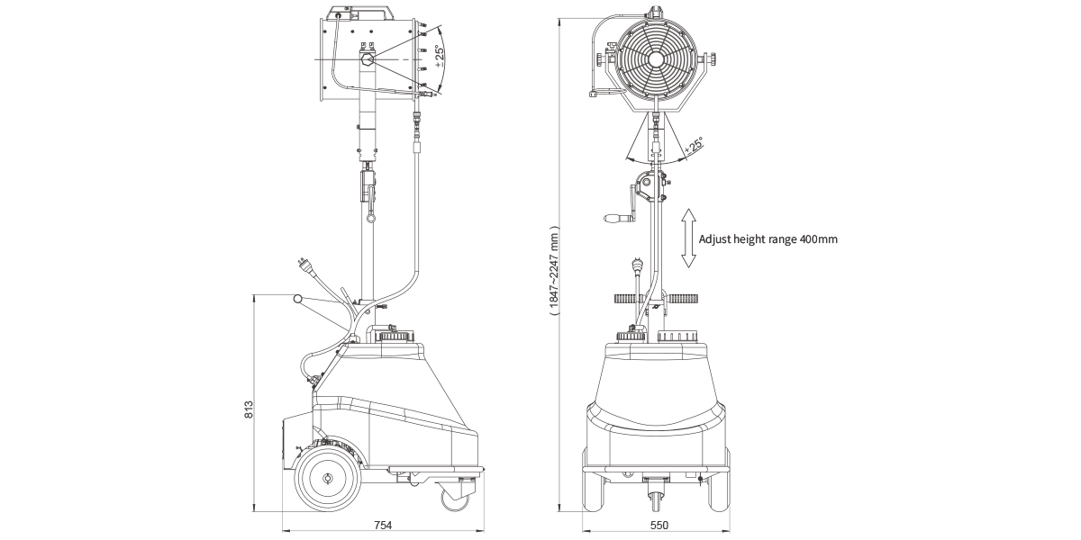 - 搭配超耐磨輪胎:可適應工地等粗糙地面環境,提高實用性。使其不受限於固定位置,能快速移動到指定位置,實現移動式的抑塵效果